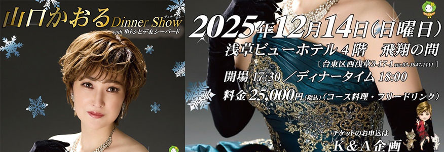 12/14(日)東京都「山口かおるディナーショー」浅草ビューホテル(要応援) 17:30開場 18:00ディナータイム 詳しくは、同封のチラシをご覧下さい。会費:25,000円(コース料理・フリードリンク付)(お申し込みはお厳込み用組にて)